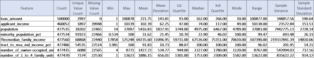 There are some large ranges in the data. It’s important to be cognizant of unit of measure when looking at the table. The range for ffiecmedian_family_income is in dollars, which may be reasonable, while the ranges for loan_amount and applicant income are in thousands of dollars, indicating there are some outliers.
